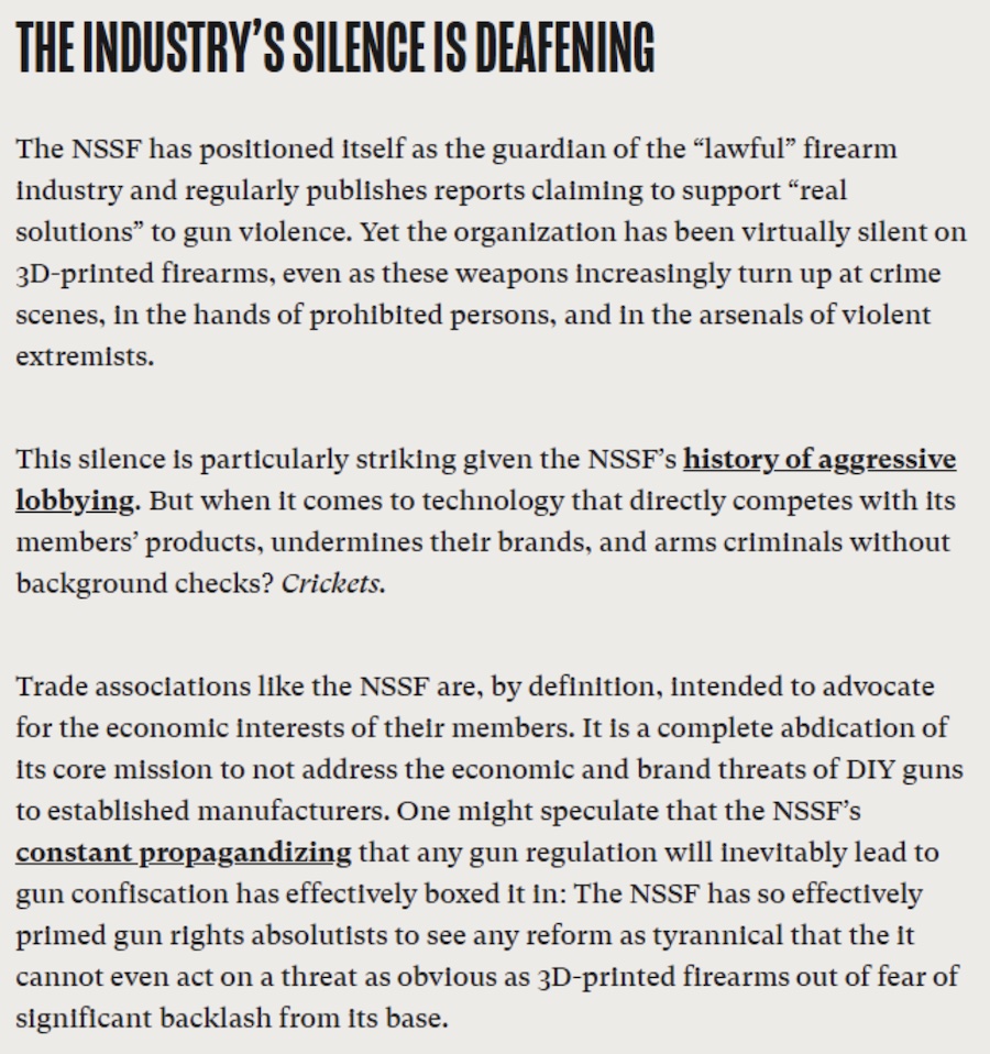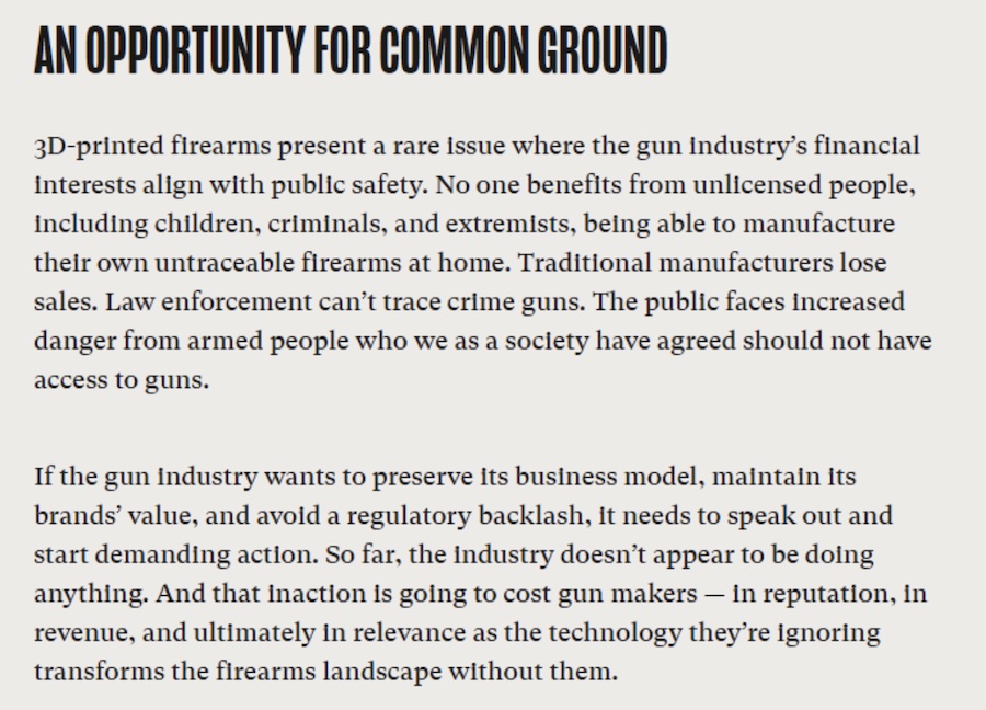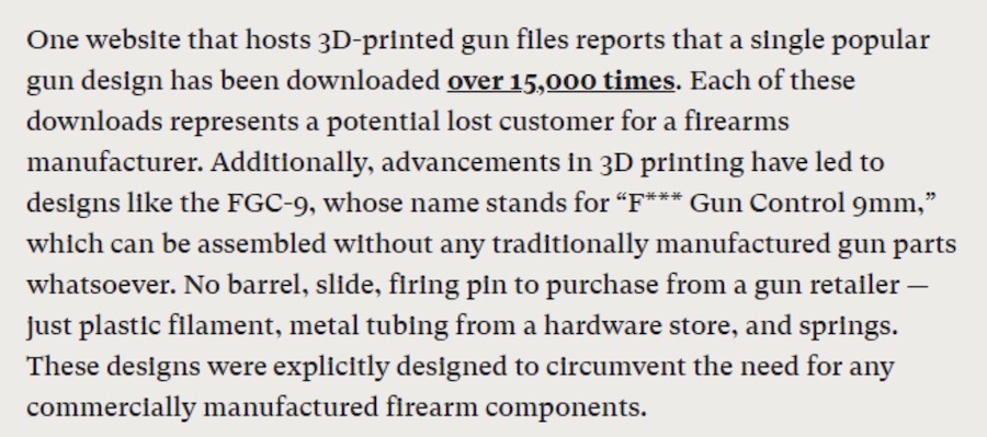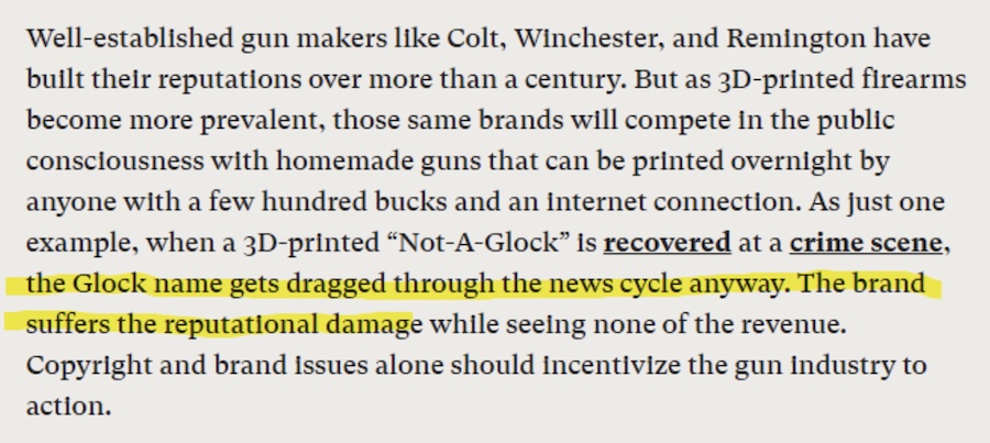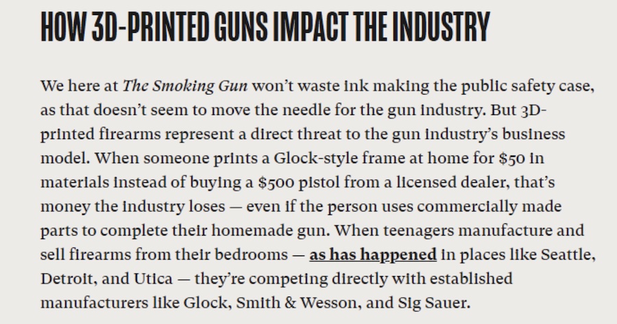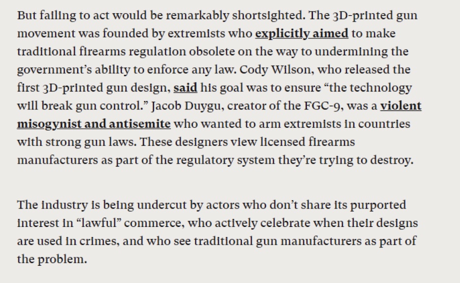 The basic premise of all of this is bizarre. I’m not sure what power they think “the gun industry” has over people 3D-printing their own guns at home.