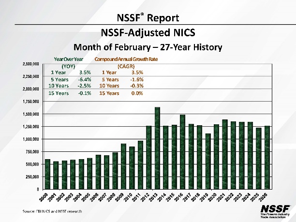 The February 2026 NSSF-adjusted National Instant Criminal Background Check System (NICS) figure of 1,265,320 is an increase of 3.5 percent compared to the February 2025 NSSF-adjusted NICS figure of 1,222,980. For comparison, the unadjusted February 2026 FBI NICS figure of 1,933,972 reflects a 13.5 percent decrease from the unadjusted FBI NICS figure of 2,236,637 in February 2025.