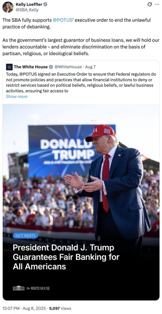 President Trump’s move is earning praise and support from those in Washington, D.C., who have been battling banking discrimination for years. Kelly Loeffler, Administrator of the Small Business Administration posted to X, “The SBA fully supports @POTUS’ executive order to end the unlawful practice of debanking. As the government’s largest guarantor of business loans, we will hold our lenders accountable – and eliminate discrimination on the basis of partisan, religious, or ideological beliefs.”