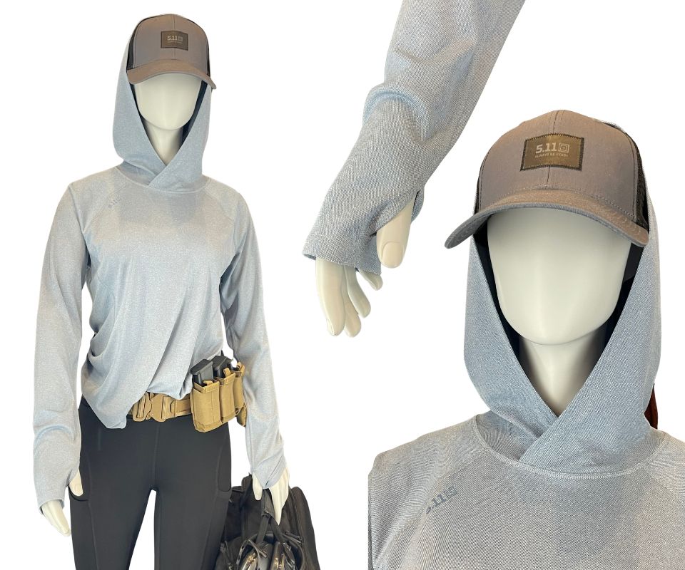 Another item I fell in love with, that I would have to wait quite a few months to use, is the womens Sulli UV Hooded Long Sleeve (also available for men). This shirt is made for a woman; it’s not boxy or bulky. You already know Im a little obsessed with necklines, and this shirt doesnt disappoint. Since Im not sure how to describe it in my own words, Ill copy the verbiage from 5.11s website, The front hood opening overlaps left over right.” This allows the hood to lie comfortably along the neck while keeping the sun off the skin. Oh, and one more thing … thumb holes in the sleeves! Need I say more?