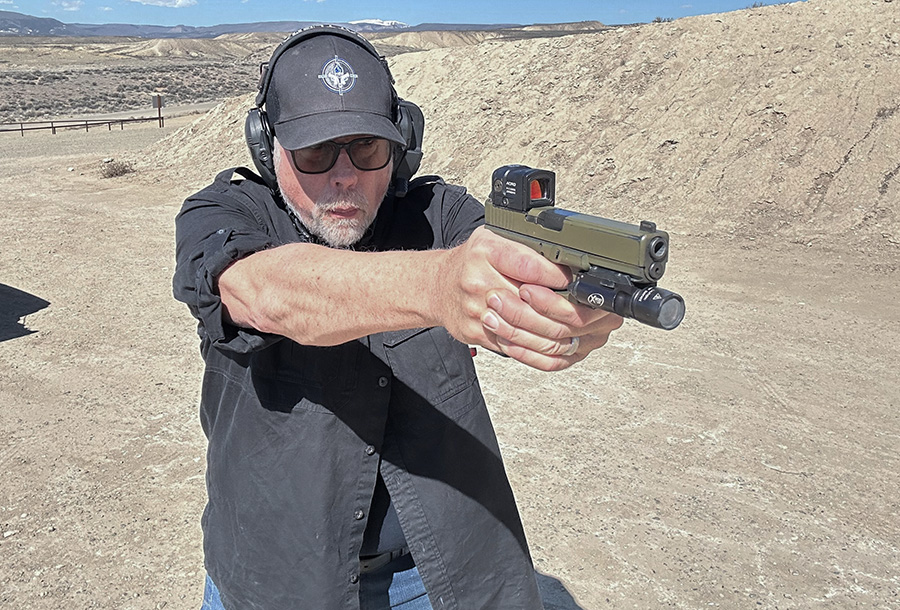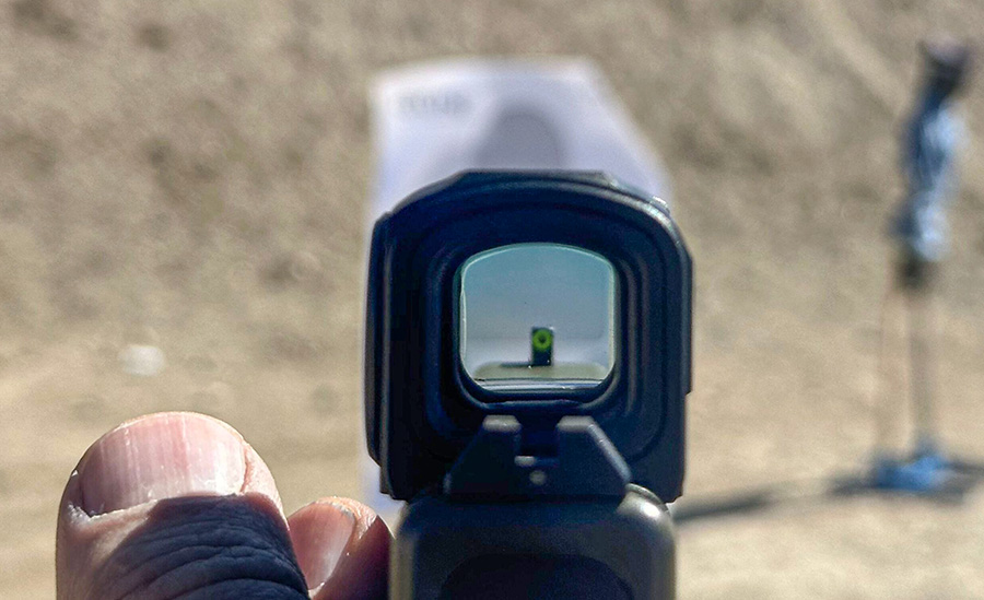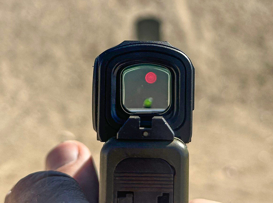 One of the issues that red dots (or green or amber) are supposed to fix is the tendency to focus intently on the threat during a lethal force encounter, while disregarding the front sight or “looking over the gun.” On paper, the ability to look through the viewing window of the optic to the threat, while allowing the dot or reticle to be superimposed on it, seems easy enough.