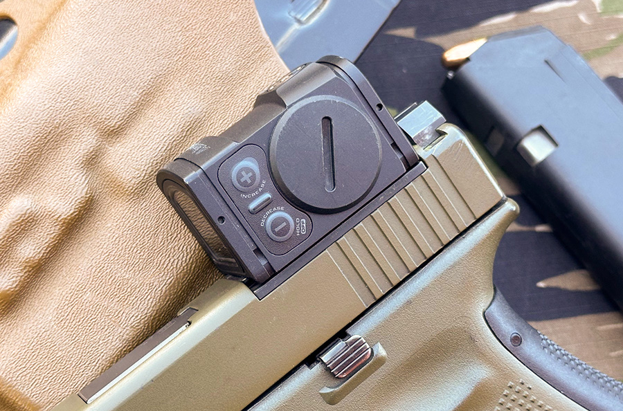 The user has the option of four night vision compatible settings and six daylight settings. For its size, weight is a relatively light 2.1 oz, not including the mounting plate for your pistol. Also, the ACRO is “water-resistant” and submersible to 115 feet (35 meters).