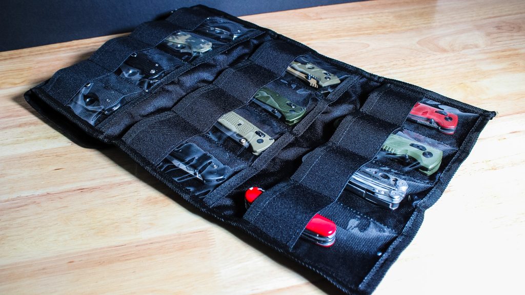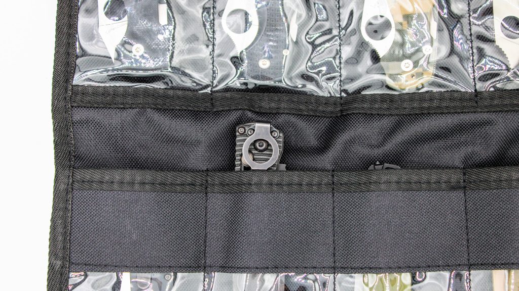 Blade HQ also offers a Jumbo version that appears to address some of these issues, but it’s currently out of stock. It has 40 clear pockets measuring 3” x 5”, and uses bungees to keep it rolled up. The Jumbo also comes with door hangers. When available, the price is $29.95.