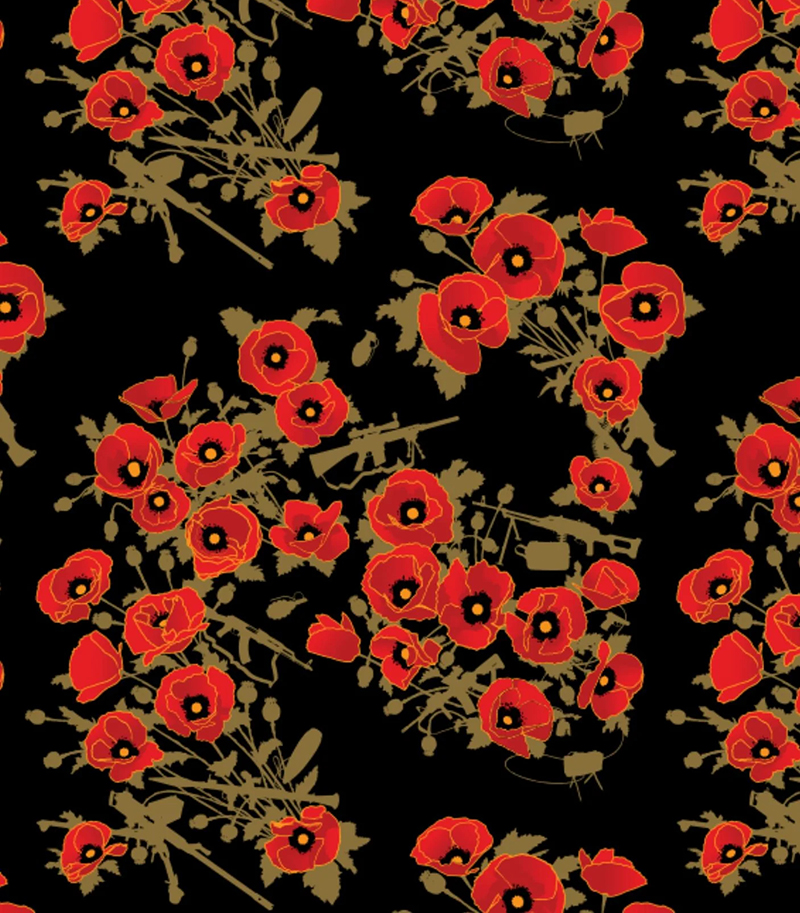 Most people do a double-take when they first see the design. Upon closer inspection, what appears to be a lovely display of poppies also contains various firearms hidden among the flowers.