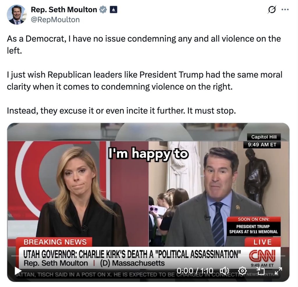 In an interview on CNN, Rep. Seth Moulton (D-Mass.) claimed that 76 percent of extremist violence and violent murders are “from right-wing extremists,” and while he condemned the “4 percent by left-wing extremists,” he segued into a call for gun control, saying, “and oh, by the way – it’s probably an appropriate time to talk about guns, too.”