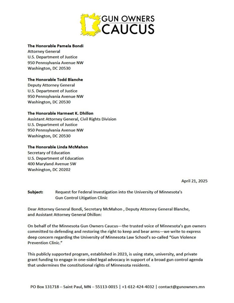 Today, we sent a letter to leaders at the United States Department of Justice and the US Department of Education requesting a federal investigation into the University of Minnesota Law School’s Gun Control Litigation Clinic.