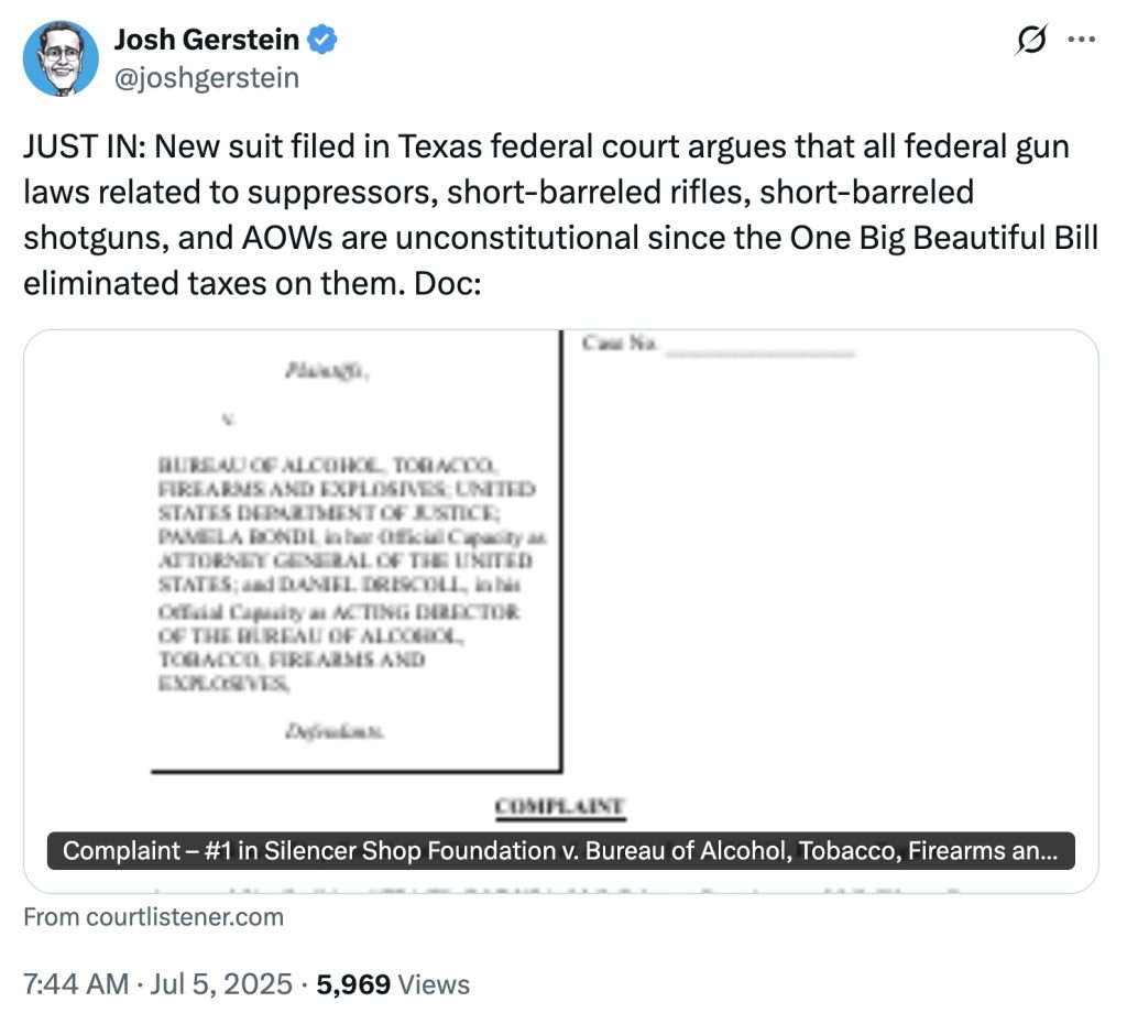 3. Considering the DOJ brief filed in May in the Peterson suppressor case now pending in the 5th Circuit, coupled with the tax removal by the OBBB signed into law on July 4th, the NFA has NO leg to stand on.