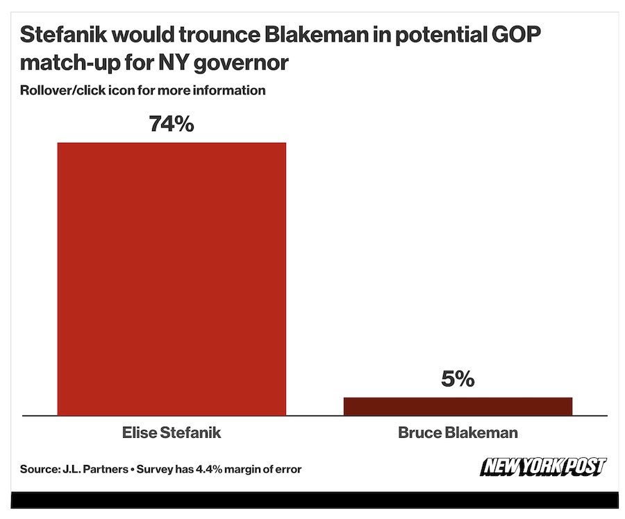 If the Long Island squish is foolish enough to actually challenge Stefanik for the GOP nomination, the latest survey of likely voters indicates that he doesn’t have a prayer. And while polling shows Stefanik in a statistical dead heat with Hochul in a head-to-head race, Blakeman is running 18 points behind the uniquely unpopular Democrat incumbent.