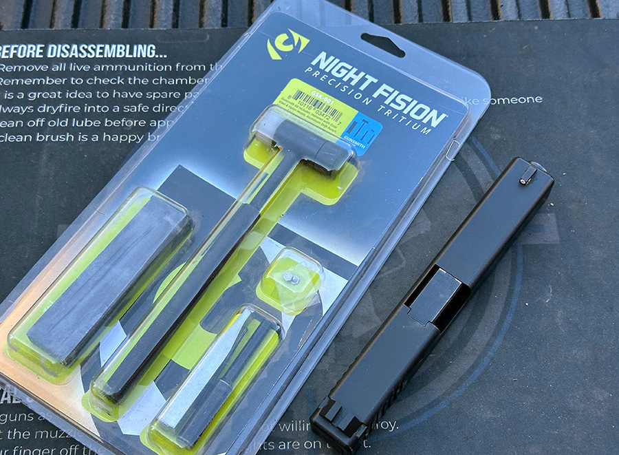 The good news about original GLOCK night sights is they’re made of steel, not plastic, so that’s a plus. However, if you want sights that (still) glow in the dark, as I did, you’ll need to replace them. GLOCK pistol sights are probably the easiest setup to switch out. I did so by installing a new set from Night Fision. They also sell a very handy and inexpensive sight installation tool kit.