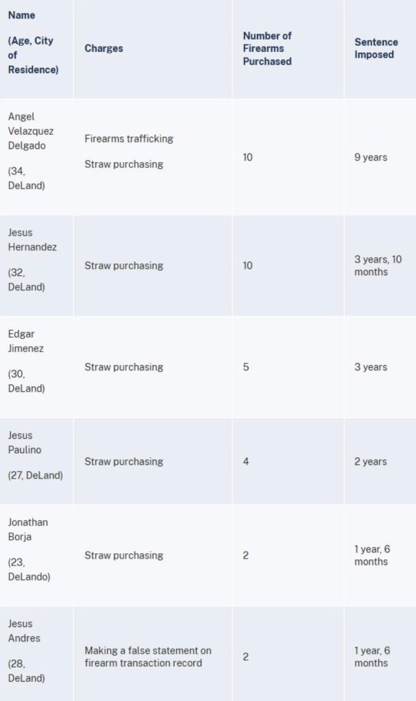 Six men who were living in DeLand, Florida have been sentenced for illegally straw purchasing and then trafficking 33 semi-automatic firearms that they sold to a violent Mexican drug cartel, the Cártel de Jalisco Nueva Generación, known as CJNG, which is located in Zitacuaro, Michoacan, Mexico.