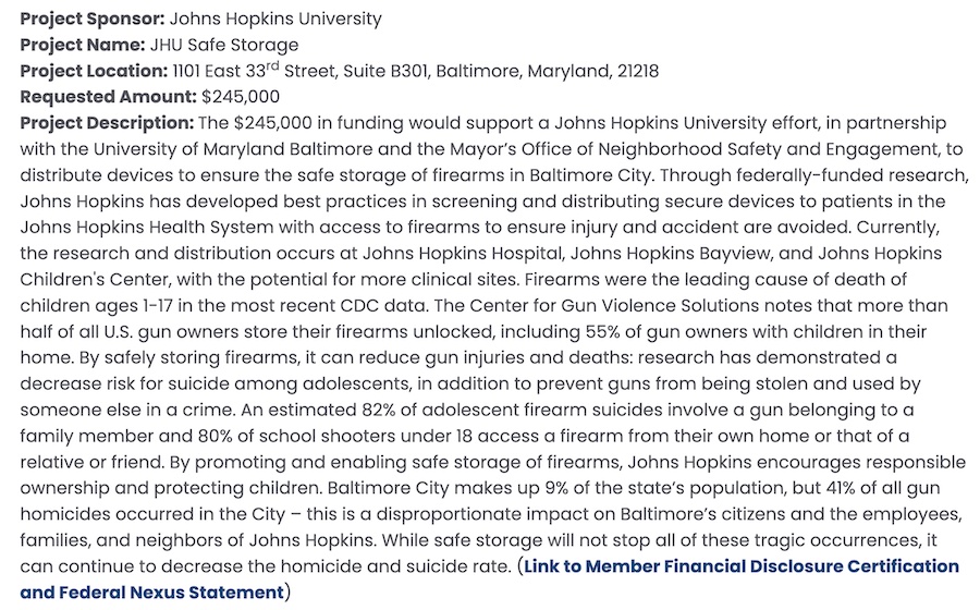 But maybe the prospect of the Bloomberg School, that’s named for America’s most prominent gun-grabber, handing out locks provided by the gun industry is more than anyone at Johns Hopkins can handle. Better, then, to have taxpayers foot the bill, right? Besides, the school has demonstrated that they’re more than happy to hoover up as many federal tax dollars as they can to further the cause of civilian disarmament.