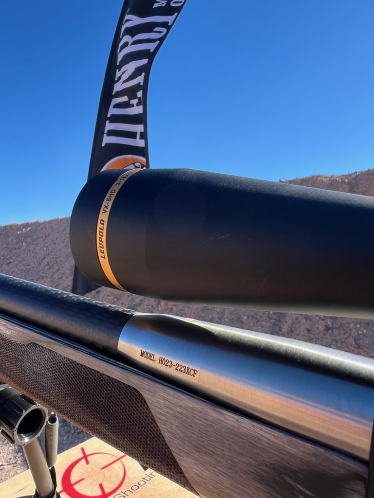 The barrel is 416R stainless steel that’s been tension wrapped with carbon fiber and is threaded. Caliber is listed as .223/5.56, and the ammo we fired was 77grain Federal .223. Henry guarantees sub-MOA 3-round groups.