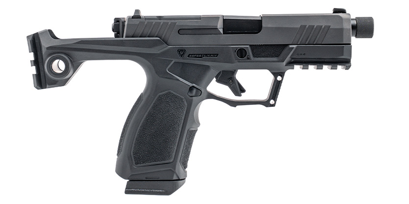 The GX4 Strike Bravo features a new chassis and modular grip system co-developed with Strike Industries, specifically engineered to accept the Strike Industries FSA Single Stabilizer. This folding brace system provides increased stability, improved length of pull, and greater surface contact for shooters. The result is greater control, improved shootability, and enhanced precision compared to a standalone handgun — all while preserving the GX4’s compact footprint.