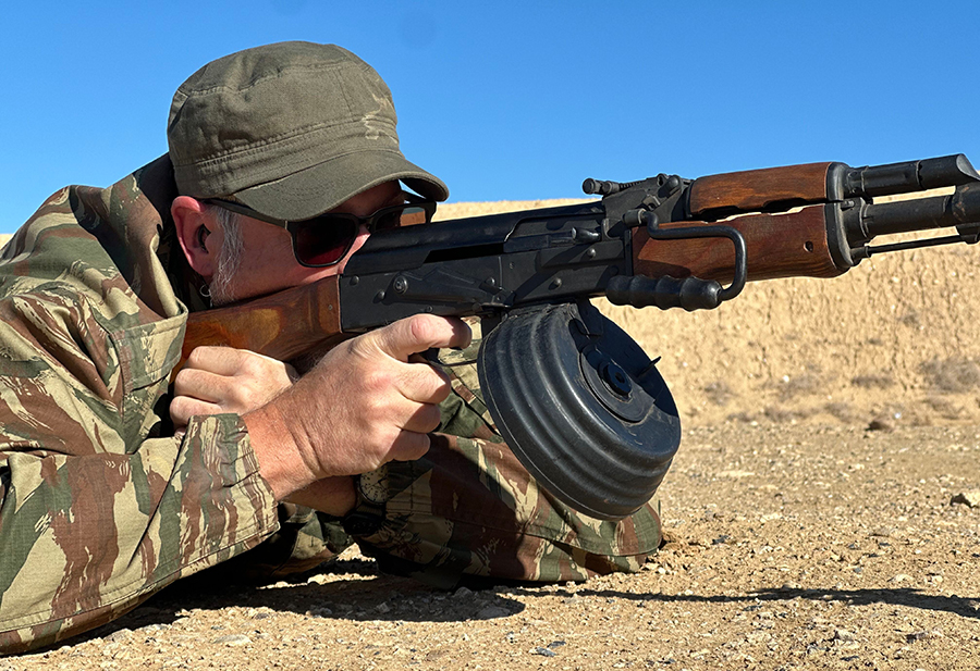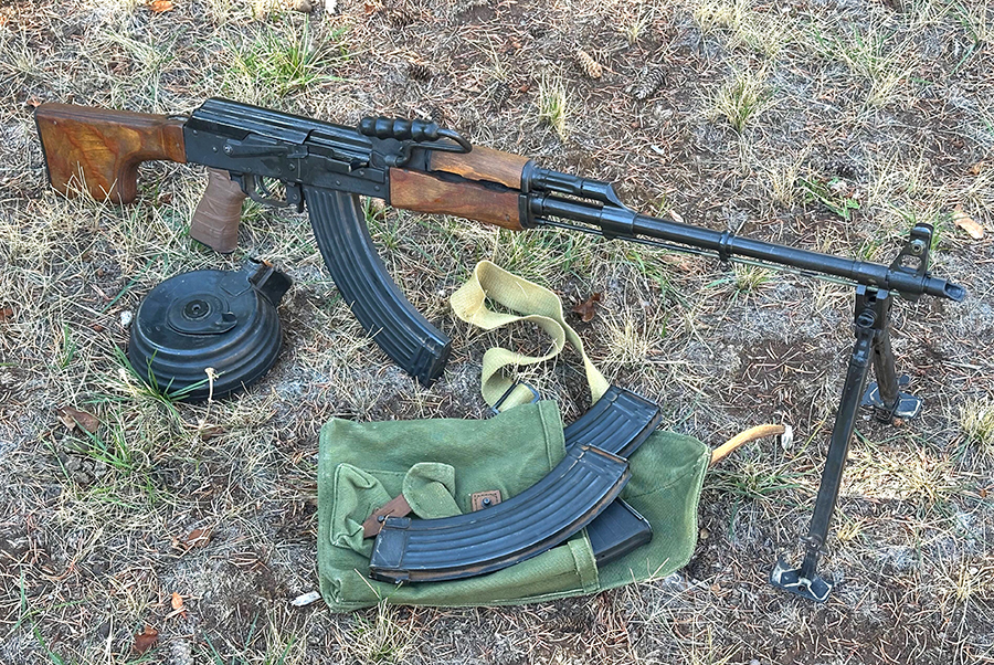 The heavy barrel is 23 inches and has a long cleaning rod onto which the steel bipod clips in place when that feature is not deployed. Unlike the lighter-barreled SAW of the NATO forces which used “quick change” barrels, the RPK barrel is fixed and cannot be swapped out.