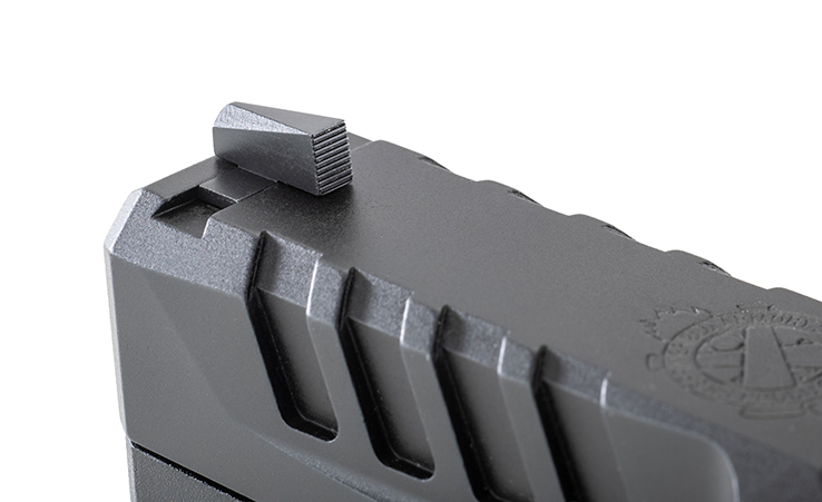 Rear sight: on the Echelon COA the rear sight both provides a co-witness and clamps the COA into the slide. It’s a black serrated sight with a U-notch—a clean, usable design I wish Springfield would offer more widely, instead of the white U-notch on some standard models.