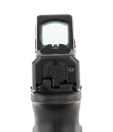 I call the mount the “ski-boot” system. The front of the optic dovetails into a matching cut on the slide and the rear sight clamps the optic firmly in place. The A-CUT is one of the strongest, most robust mounting systems to come along in years.