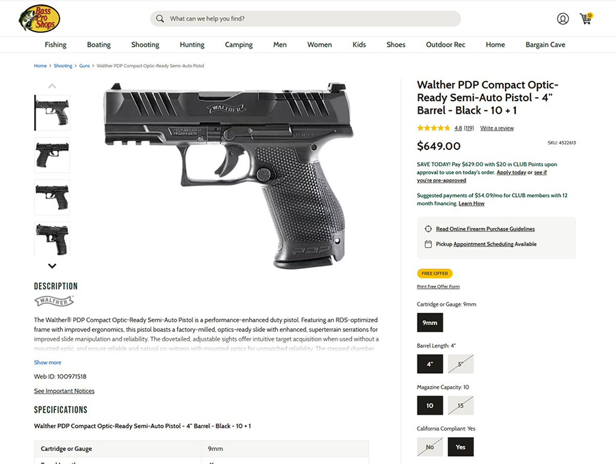 But Bass Pro also lets you select the California-compliant model instead, which comes with the state-mandated loaded chamber indicator, magazine disconnect mechanism, and 10-round limited capacity magazines. Those unwanted but required “features” turn a $530 gun into a $650 gun.