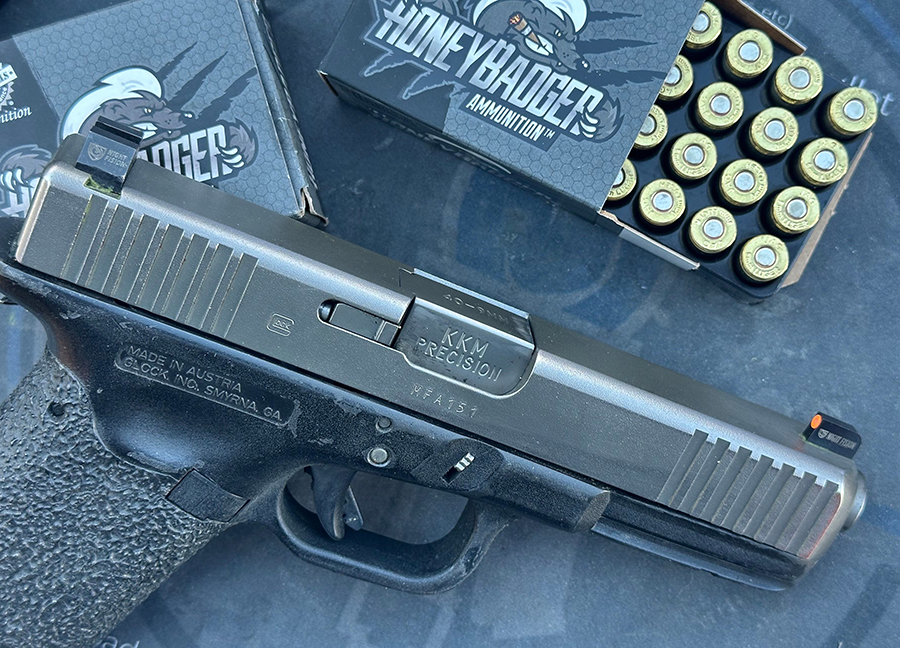 Having previously converted my original Gen2 GLOCK 23 to shoot 9mm with a drop-in barrel, I knew that would work for the G22 as well. Before shipping the pistol to Robbie, I made arrangements to get a conversion barrel from KKM Precision. KKM offers numerous aftermarket barrels for GLOCK pistols with fully supported chambers. I’ve used their barrels in the past and been impressed by the inherent accuracy and reliability they provided. For this particular project I ordered a G22 match conversion barrel chambered in 9x19mm.