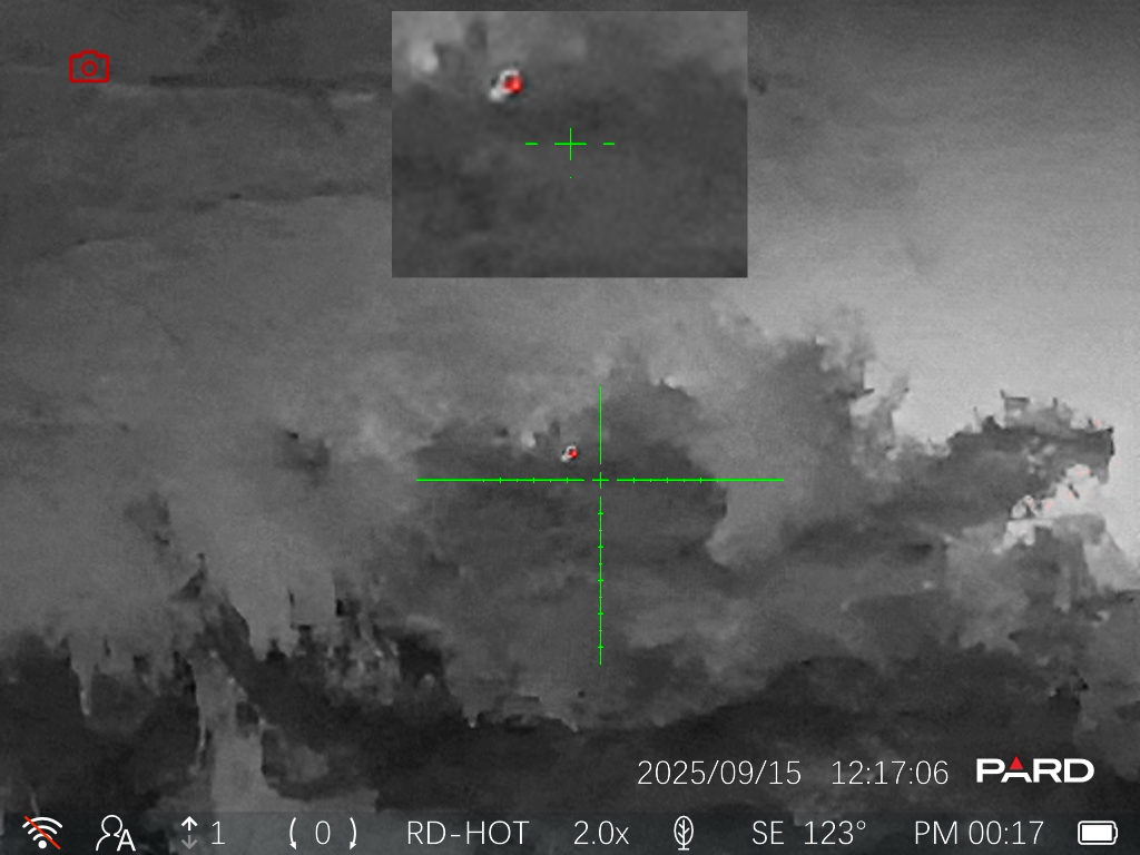 There’s a bunch of information seen in my screenshots here across the bottom of the display, which can be turned off in the display settings menu and can be moved between top/bottom/right — most items can also be toggled on/off individually — but I left it all on as I thought it was pretty spiffy. The very affordable PARD displays whether or not the WiFi is on, which profile is loaded, gyroscope information (scope tilt and cant), image mode, magnification level, scene mode, compass heading, time, and battery status.
