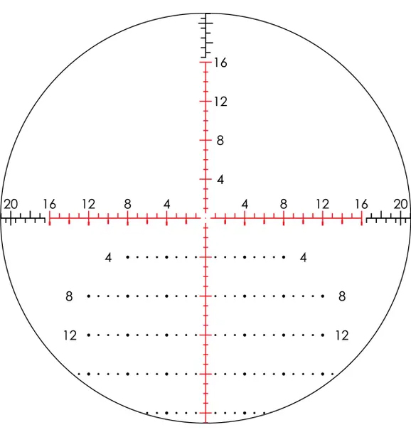 • Max Windage Adjustment: 25 MRAD, 86 MOA