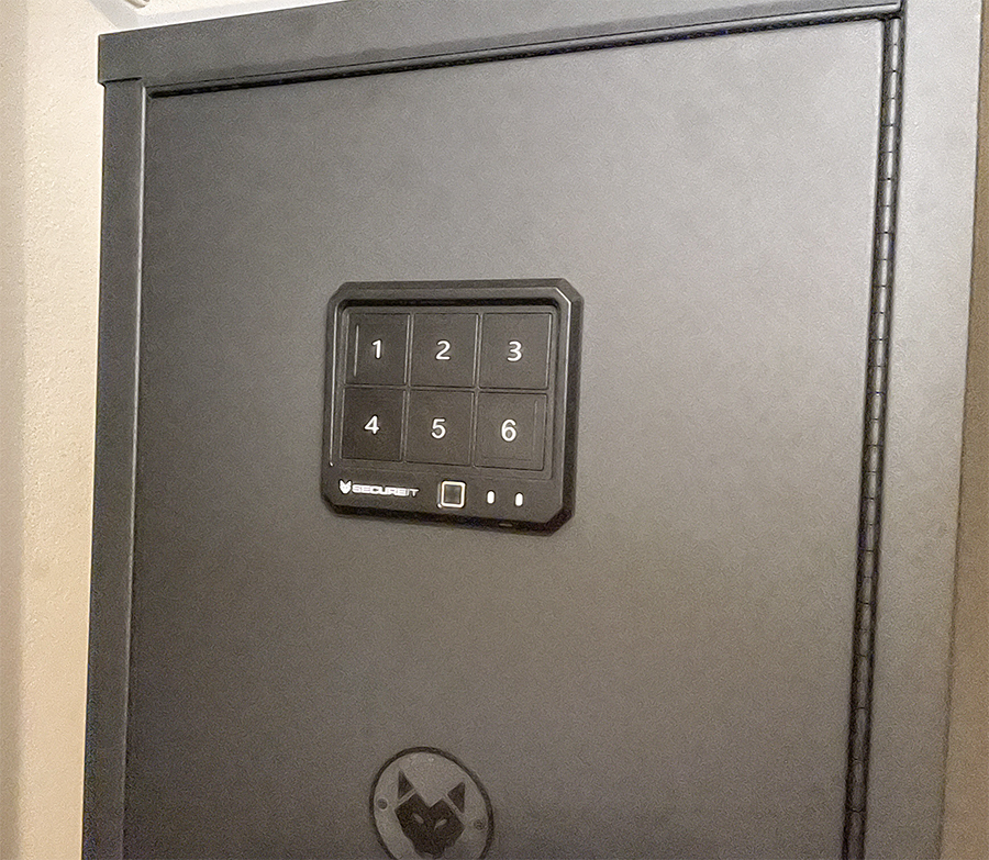 There’s also a standard key backup in case your battery dies. If you remove one of the screws that holds the wolf head logo plate on the door below the keypad (see above), that exposes a keyhole you can use to open the safe the good old fashioned way.