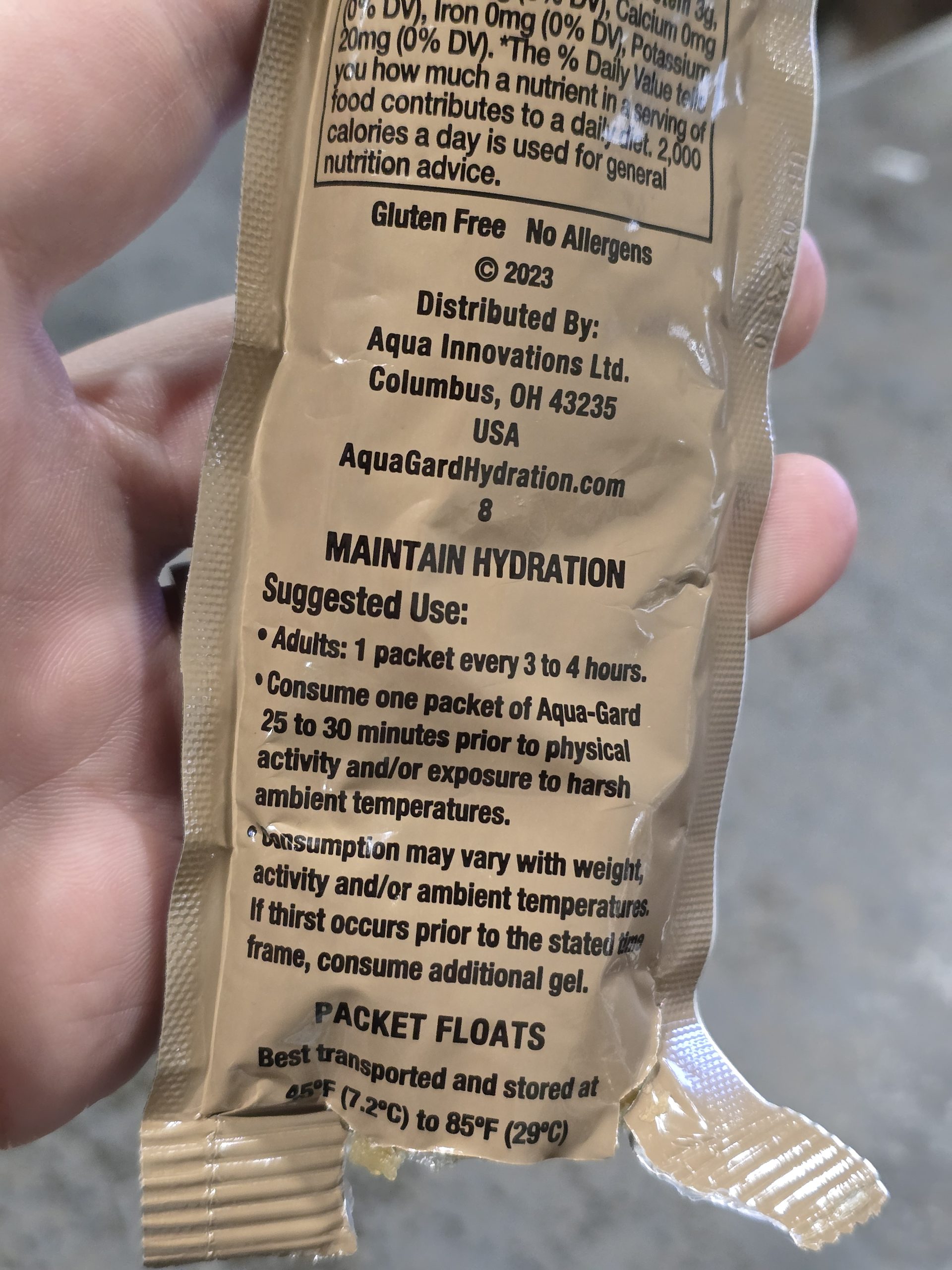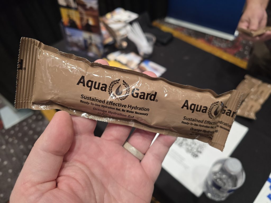It’s extremely concentrated hydration that you eat rather than drink…and I availed myself of some this year at SHOT Show. Called Aqua-Gard (available on Amazon), it’s ready-to-eat out of the long-term, storage-stable packet and it delivers 3.5 to 4 hours of hydration in just three ounces of product.
