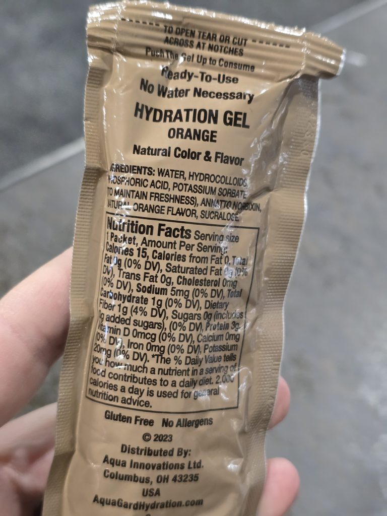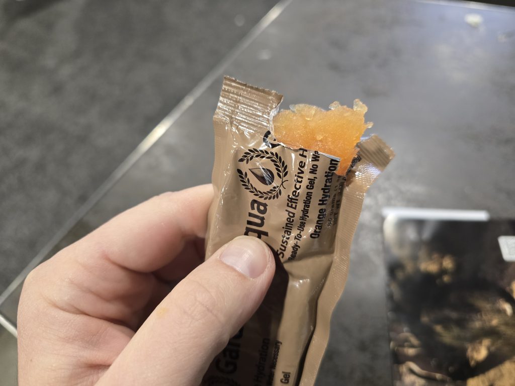 I found the lightly orange-flavored gel perfectly palatable, if slightly boring. It’s easy to consume and, in theory, it kept me hydrated while I did over 17,000 steps yesterday wandering the SHOT Show floor. At the same time, hydrating with Aqua-Gard doesn’t make you pee like hydrating with liquids does. The gel has the absolute bare minimum amount of liquid in it to make it edible and functional.