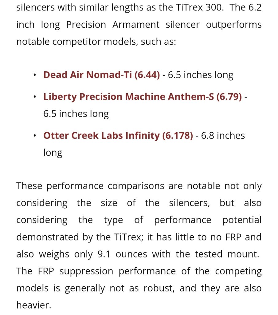 To summarize the results as aggressively as I can, the TiTrex beats nearly every other .30 cal suppressor ever tested on full power 308 Winchester in every metric minus a couple of ties and coming in 1 to 2 dB “louder” in one scenario than a suppressor that’s 25% longer and 34% heavier. Inch-for-inch and ounce-for-ounce it’s particularly dominant.