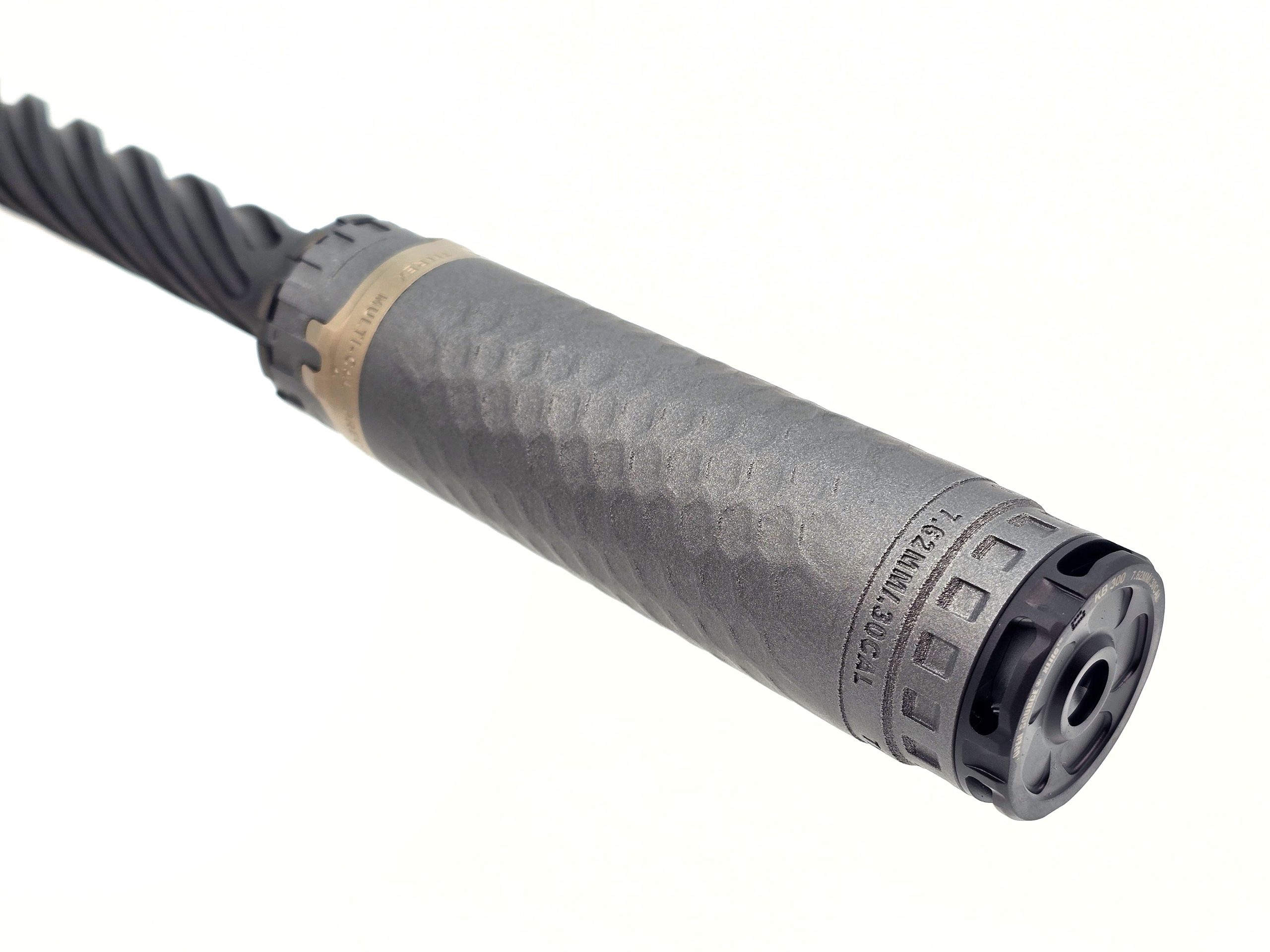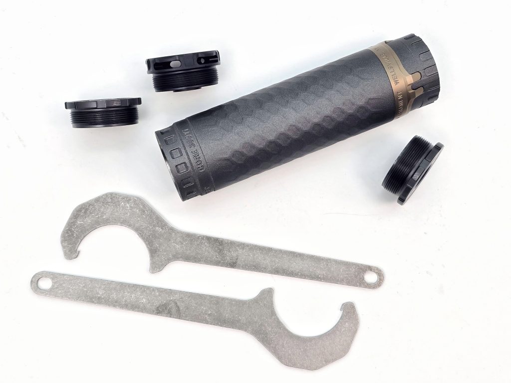 HUB and “open source” compatible: at its base, this X-CORE is HUB threaded for compatibility with any HUB/Bravo mount on the market. At the front, it’s designed for compatibility with SilencerCo Bravo-style front caps and accessories, which opens the owner up to a growing ecosystem of caps, brakes, and more. The TiTrex, at least in this .30 cal titanium flavor X-CORE version, ships with a titanium 5/8×24 direct thread mount and two front caps: a flush one and a K-Brake Ultracompact Brake version.