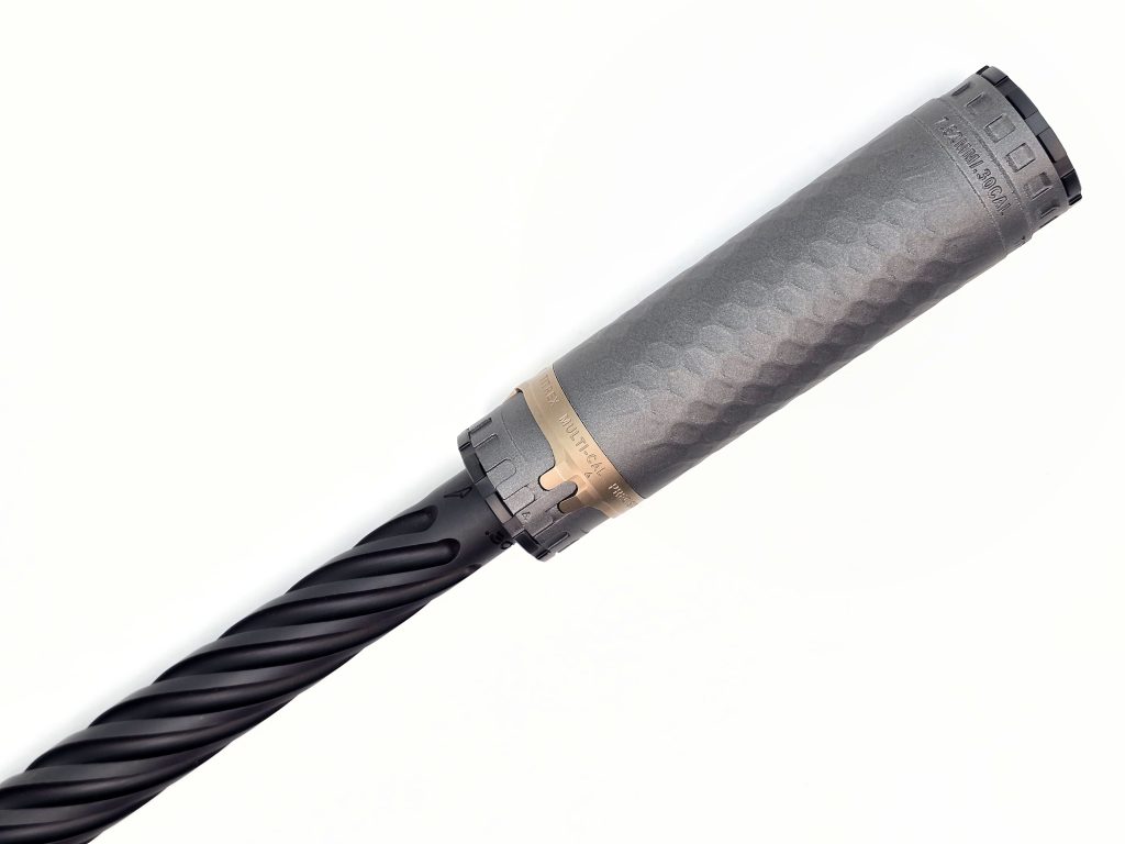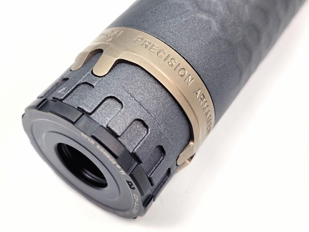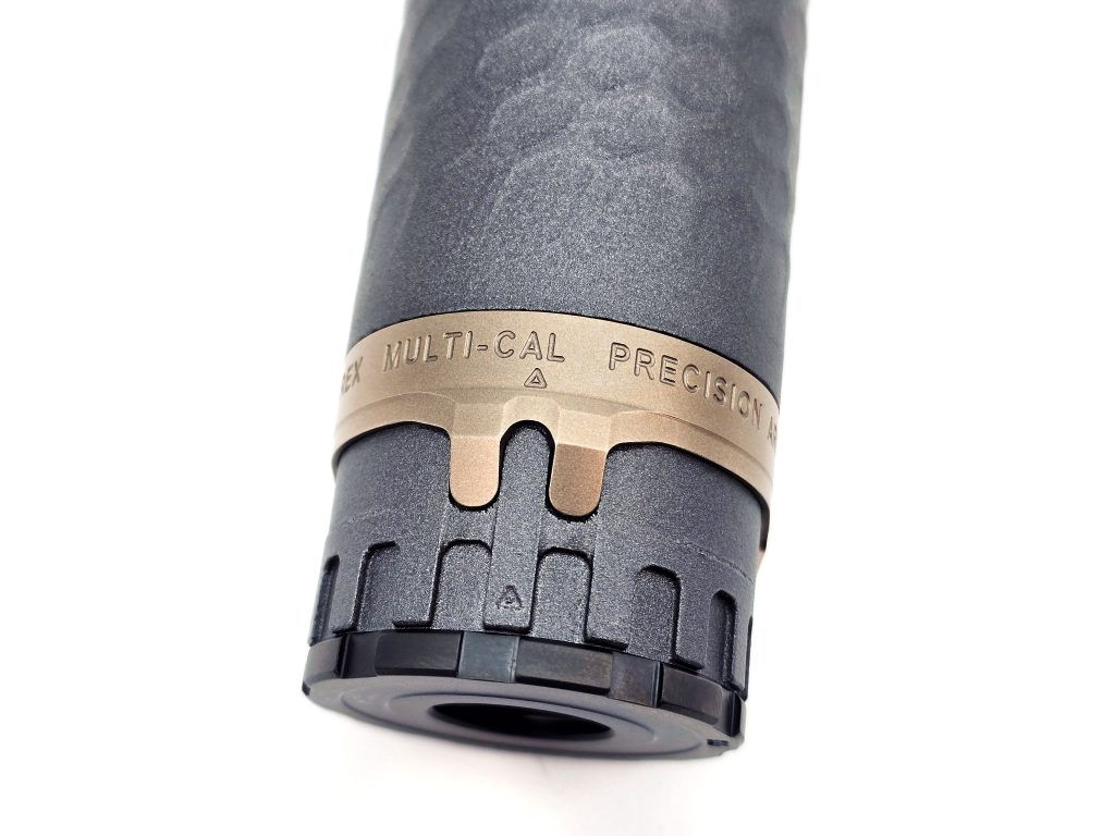 Xband: that good-looking 17-4 stainless steel ring around the base of the TiTrex is the serialized part of the silencer. It’s marked as Multi-Cal and it’s pressed onto the body where it clicks firmly into place. Precision Armament does this to achieve “endless upgradeability” and “unlimited repairability.” It basically future-proofs your TiTrex, as Precision Armament is able to remove the Xband and install it on a new core, whether that’s to replace a damaged core or to swap it for a new one of a different design, material, or caliber.